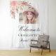 Una alfombra de bienvenida para una fiesta de soltera elegante y moderna. Fondo blanco, decorado con hierba de pampas de estilo boho y flores rosadas y doradas rosa. Personaliza y añade una foto dentro del marco del arco, nombre.
