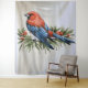 Preciosa tapicería de pájaro rojo y azul posado en una rama de acebo. Decora tu hogar para Navidad con este arte de pared festivo.