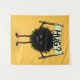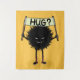 Un gran tapiz con un monstruo malvado lindo - un personaje peludo sonriente de la familia del Malvado Flor Bug. Lleva un cartel con el mundo escrito a mano "¿Abrazo?". Esta criatura rara amigable tiene calcetines lindos y sin mangas solamente para mantener sus pies calientes en este mundo poco amigable.