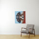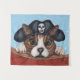 Este tapiz de pared tiene un lindo gato blanco y marrón con una mirada asustada en su cara colgando en el costado de un bote rojo bajo un cielo azul usando un gorra pirata negro con un cráneo.