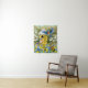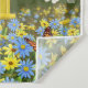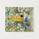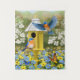 Un par de pájaros voladores orientales hacen su hogar en una bonita casa de pájaros amarillos dentro de un hermoso jardín primaveral lleno de margaritas azules y amarillas y rodeado de madera de dogwood florida. Naranjas y mariposas azules también visitan las flores. Obra de arte original creada por la artista de vida silvestre Crista S. Forest.