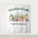 Señal de bienvenida y foto de fondo con un ilustracion acuarela de animales de bosque con su tienda y fogata acampando en las montañas y el bosque y "Aventura espera" y el nombre de la futura madre en un guión verde oscuro para cazadores.