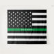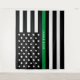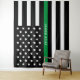 Esta tapicería que se puede utilizar como telón de fondo para fotos en ocasiones especiales, presenta una bandera americana de línea verde fina en blanco y negro junto con el nombre de un oficial para personalizar.