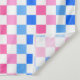 A checkerboard pattern of pink, blue, and white squares creates a vibrant and lively visual effect, conveying playfulness and energy.