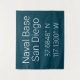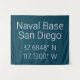 Coordenadas de mapas de latitud y longitud para la base naval de San Diego en California - también conocida como Estación Naval de la Calle 32, hogar del tipo de letra blanca estilo Roboto de la Flota del Pacífico sobre fondo azul marino.