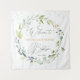 Tapiz de Bautizo/Bautismo de bebé. Este diseño presenta una ilustración de follaje verde y hojas de eucalipto en estilo acuarela. Encima de las hojas, confeti adorna la parte superior del tapiz (sus imágenes se pueden eliminar). En la parte superior de la corona hay una imagen de una Cruz.