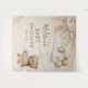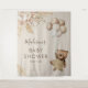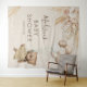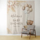 Tela de baby shower bohemio con oso bebé pintado con acuarela vintage, globos, hierba de pampas rústica boho y flores, además de una plantilla de texto moderna fácil de personalizar sobre fondo marrón claro.