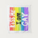 Esta obra de arte muestra un arcoiris colorido con la frase "Bésame I Am Gay".