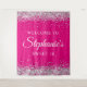 Una caligrafía moderna y elegante con un estilo moderno y todo tipo de letra en blanco. Crea tu propio Sweet 16 cumpleaños fiesta de cumpleaños número 16, telón de fondo de bienvenida para tu amigo. El fondo presenta gráficos de arte digital falsos purpurinas de color gris plateado sobre un sólido fondo de color rosa caliente que se imprime como una foto. Decimosexto cumpleaños para ella.