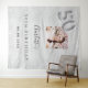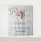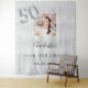Una alfombra de bienvenida para una fiesta de cumpleaños 50 glamurosa. Un fondo metálico plateado falso decorado con polvo de purpurina falso. Personalice y agregue una foto de alta calidad, nombre y fecha. El número 50 está escrito con una fuente estilo globo. También se puede utilizar como telón de fondo para fotomatón y decoración de pared de fiesta.
