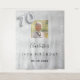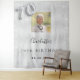 Una alfombra de bienvenida para una fiesta de cumpleaños 70 glamurosa. Un fondo metálico plateado falso decorado con polvo de purpurina falso. Personalice y agregue una foto de alta calidad, nombre y fecha. El número 70 está escrito con una fuente estilo globo. También se puede utilizar como telón de fondo para cabina de fotos y decoración de pared de fiesta.