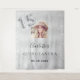 Un tapiz de bienvenida para una fiesta de cumpleaños número 15 femenina y glamurosa de Quinceañera. Un fondo metálico plateado falso decorado con polvo de brillo falso. Personalice y agregue una foto de alta calidad, nombre y fecha. El número 15 está escrito con una fuente estilo globo. También se puede utilizar como telón de fondo para cabina de fotos y decoración de pared de fiesta.