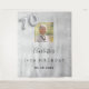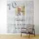 Una alfombra de bienvenida para una fiesta de cumpleaños 70 glamorosa. Un fondo metálico plateado falso decorado con polvo de purpurina falso. Personalice y agregue una foto de alta calidad, nombre y fecha. El número 70 está escrito con una fuente estilo globo. También se puede utilizar como telón de fondo para cabina de fotos y decoración de pared de fiesta.