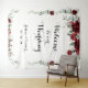 Una señal de tapiz de bienvenida a nuestra boda de color burdeos que presenta un paisaje pintado con acuarela de peonías rojas burgundy y vegetación de eucalipto plateado con 2 vides en cascada a cada lado de un bonito texto en caligrafía blanca que da la bienvenida a sus invitados a su boda con sus primeros nombres y fecha de la boda numérica contra un fondo blanco cálido.