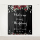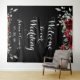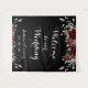 Un letrero de tapiz de Bienvenidos a nuestra boda con flores de acuarela borgoña que da la bienvenida a sus invitados a su boda contra un fondo negro con escritura de guión bonito blanco.
