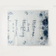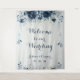Una señal de bienvenida a nuestra boda de acuarela floral en azul marino y azul polvoriento que da la bienvenida a sus invitados a su boda contra un fondo azul marino con escritura de caligrafía blanca y fecha numérica.