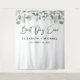 Tela de fondo elegante para cabina de fotos de boda con eucalipto verde agua y "Mejor día" en letra moderna, sus nombres y la fecha.