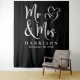 Tapiz moderno personalizado negro para telón de fondo de fotos para su recepción de boda u otros eventos de boda con "Sr & Sra" escrito en una gran escritura blanca elegante y una ilustración de dos corazones unidos. Agregue su nombre de casados y fecha de boda.