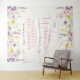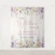 An elegant light cream baby girl shower welcome tapestry and photo backdrop featuring "a little wildflower is on her way" in a blend of grey typography and a stylish pink script, and boho-inspired whimsical watercolors of dainty purple, pink and yellow wildflowers. Add the name of the mother-to-be in simple pink lettering.