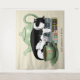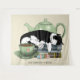 Un lindo gato de esmoquin blanco y negro durmiendo en un montón de libros con una tetera verde detrás y una taza de té delante