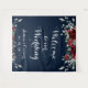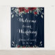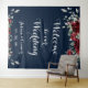 Una señal de tapiz de bienvenida a nuestra boda de acuarela borgoña floral que da la bienvenida a sus invitados a su boda contra un fondo negro con escritura de guión bonito blanco.