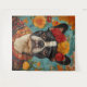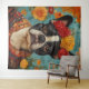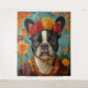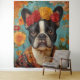 Una impresionante pintura digital de un Bulldog francés estilo Frida Kahlo, con una vibrante corona floral y vestimenta tradicional mexicana. El trabajo de arte combina texturas ricas, colores llamativos y detalles intrincados, capturando la esencia del icónico artista de una manera única y encantadora.