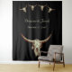 Telón de fondo de cabina de fotos de boda rústica occidental con cráneo de toro vaca en beige y negro estilo vintage antiguo. Diseño de fondo con escenario de estilo granja campestre antiguo. Propiedad de matrimonio inspirada en vaquero del oeste salvaje. Cuatro cráneos en un patrón con tipografía personalizada de nombre y fecha. Suministros de fiesta de animales de granja trendy y cool. Derechos de autor de la imagen Marg Seregelyi Photography.