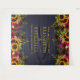 Ramos de girasoles amarillos dorados y rosas borgoña rojas oscuras en bordes sobre un fondo azul marino de medianoche oscuro con su texto personalizado en tipografía dorada falsa que crea un hermoso fondo de boda rústico para cabina de fotos. ++++++++++ Fácil de personalizar y perfecto para bodas temáticas rústicas vintage tradicionales de finales de verano, otoño o invierno.