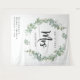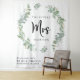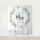 Una elegante tapicería de fondo para cabina de fotos para tu despedida de soltera con un wreath de agua de color verde musgo de follaje de eucalipto y "La futura Sra" en una tipografía grande y moderna. Personaliza con los apellidos de casada y nombres de la novia y fecha de la despedida. Se deja un rincón inferior en blanco para que tus invitados tomen fotos.