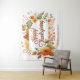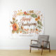 Este hermoso telón de fondo de cabina de fotos de fiesta Feliz Día de Acción de Gracias presenta un encantador borde de hojas de otoño y flores otoñales en acuarela alrededor de su elegante mensaje Feliz Día de Acción de Gracias en letra cursiva. Personalice con el nombre de su familia o empresa en tono marrón claro en medio de los tonos terrosos naranja y amarillo en esta linda tapicería.