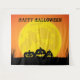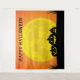 Crea un fondo para fotos con esta tapicería de Halloween que presenta 3 calabazas espeluznantes, y una luna llena en un fondo naranja. El texto personalizado "Feliz Halloween" se puede cambiar o eliminar.