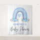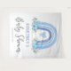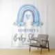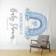 Tapiz rústico bohemio de baby shower de niño con un simple fondo blanco, un arcoíris boho de acuarela lindo, flores azules elegantes y una moderna bienvenida a la plantilla que es fácil de personalizar.