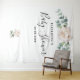 Elegante, clásico, moderno estilo floral pancarta de baby shower, tapiz. Decorado con peonías pintadas con acuarela blanca, flores y vegetación de eucalipto. Con el texto: Baby Shower escrito con un estilo de letra manuscrita negra grande y moderna. Personaliza y añade el nombre de la futura madre y una fecha. Se puede utilizar como pancarta de bienvenida, decoración de pared para la fiesta de bebé o como telón de fondo para fotos. Neutro en cuanto al género.