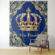 Póster de fondo para baby shower de príncipe extra grande con hermosas espirales doradas y corona azul real y dorada. Este hermoso banner de fondo de príncipe se personaliza fácilmente con el texto de su elección.