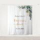 Un fondo blanco chic. Decorado con hojas de eucalipto pintadas con acuarela verde, ramitas, follaje y hojas doradas falsas. Personalice y agregue el nombre de la novia y una fecha. Letras negras y doradas. Se puede utilizar como pancarta de bienvenida para la despedida de soltera, como decoración de pared para la fiesta o como telón de fondo para cabina de fotos.