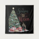 This is a festive and traditional holiday illustration centered around a richly decorated Christmas tree and a collection of wrapped gifts. The tree is a deep green, adorned with warm string lights, white, red, and gold ornaments, and topped with a bright star. At its base are several red, white, and gold presents tied with bows, resting on a snowy or frosted ground. To the right, four lit candles in a black candelabra cast a warm glow. The image is overlaid with elegant, large script that reads "The Season" in dark green and gold, and "The Reason" in deep red, conveying a classic holiday message.