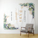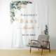 Un fondo blanco chic. Decorado con hojas de eucalipto acuarelas verdes, ramitas, follaje y hojas doradas falsas. Personaliza y añade el nombre de la futura mamá y una fecha. Letras negras y doradas. Se puede utilizar como pancarta de bienvenida para la fiesta de bebé, como decoración de pared o como fondo para cabina de fotos.