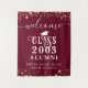 Bienvenido a los alumnos a su reunión de clase de secundaria o universitaria (editable para cualquier reunión de año) con este tapiz de color personalizado para ser usado como un fondo de foto o cartel con estrellas de oro, luces de cuerda, guión de caligrafía y tipografía decorativa y personalizado con el nombre de tu escuela y año de curso de graduación. Los colores (mostrados en marrón/borgoña, dorado y blanco) se pueden cambiar a los colores de la escuela o coordinar los colores del tema fiesta en EDIT. OPCIONES DE TAPESTRÍA: El ejemplo se muestra en el tamaño de 50x60"; hay otros tamaños disponibles en la página de pedidos. ASISTENCIA: Para obtener ayuda con la modificación o personalización del diseño, el cambio de color, el cambio de tamaño o la transferencia del diseño a otro producto, póngase en contacto con el diseñador ANTES DE PEDERLO a través de la pestaña del MENSAJE de chat de Zazzle que aparece a continuación o envíe un correo electrónico a makeitaboutyoustore@gmail.com.