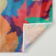 Hojas coloridas rojas, amarillas, naranjas, azules, cian, verdes, turquesas y verde azuladas caídas de otoño sobre un fondo azul oscuro y violeta. Pintura fantástica.