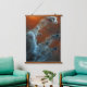 Vista de medio infrarrojo de los Pilares de la Creación. Miles de estrellas que existen en esta región desaparecen, y capas aparentemente interminables de gas y polvo se convierten en la pieza central. El polvo es un ingrediente importante para la formación de estrellas. Muchas estrellas se están formando activamente en estos densos pilares azul-gris. Cuando los nudos de gas y polvo con suficiente masa en esas regiones, empiezan a desplomarse bajo su atracción gravitacional, se calientan lentamente y con el tiempo forman nuevas estrellas. Las estrellas al final de los gruesos y polvorientos pilares han erosionado recientemente el material que los rodea. Aparecen de rojo porque sus atmósferas siguen envueltas en mantas de polvo. En cambio, los tonos azules indican estrellas más antiguas que han vertido la mayor parte de su gas y polvo. La luz de infrarrojos medio detalla las regiones densas de gas y polvo. La región roja hacia arriba, que forma una delicada forma V, es donde el polvo es difuso y más frío.
