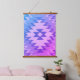 Este es un tapiz de tela con una huella de un patrón geométrico Navajo. Los colores son azul intenso, rosa y violeta. NOTA: El tapiz NO está tejido, es arte fotográfico de un diseño tejido. El tapiz está cortado con barandillas de madera en la parte superior e inferior.