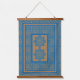 Este hermoso tapiz colgante presenta un patrón de medallón tribal azul en un fondo rojizo. Tiene una franja de madera en la parte superior e inferior. Este patrón viene de un mosaico hecho a mano por el fabricante de azulejos de Oregón Fay Jones Day.