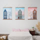 Un hermoso conjunto de tres casas de alquiler, una al lado de la otra, de diferentes colores, con árboles, bicicletas y postes luminosos