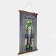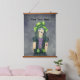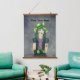 Este tapiz con perchas de madera tiene un chica de aspecto gótico con un gorra verde brillante, un vestido morado y negro con tatuajes y guantes sin dedos sobre un fondo gris oscuro.