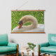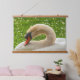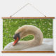 Una fotografía de primer plano captura a un cisne mudo en un momento sereno de sueño. Su cabeza está doblada, su pico naranja limpiando suavemente sus plumas blandas y blancas. Los ojos negros del cisne están cerrados, lo que sugiere un estado de relajación. El fondo es un manto de hierba verde y flores blancas que crean un entorno tranquilo y natural.