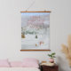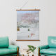 Country Christmas with cabin, snowman, and two bunnies. A snow covered scenery on a tapestry with personalized family name.