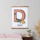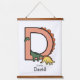 Este diseño "D es para..." es un concepto de decoración de pared personalizada que combina tipografía juguetona con un tema de dinosaurios. La letra "D" está ilustrada de manera creativa con un dinosaurio verde asomando por un lado, un dinosaurio amarillo caminando en la parte inferior y placas de estilo estegosaurio naranja formando un patrón único a lo largo de la parte posterior de la "D".