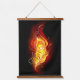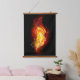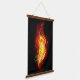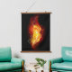 Una brillante pluma de pavo real hecha de fuego y llama sobre fondo negro.