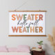 Esta vibrante obra de arte de otoño captura perfectamente la esencia acogedora de la temporada con su juguetona tipografía y su paleta de colores cálidos. El diseño presenta la atrevida frase "Sweater Weather" (clima más dulce) en letras grandes y bloqueadas que alternan en tonos naranja, beige, verde y marrón, evocando los cambiantes colores de las hojas de otoño. La frase "hola caída" está enclavada en el medio, escrita en un guión fluido y cursivo que añade un toque de elegancia y calidez al diseño.