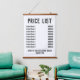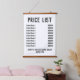 Lista de precios de Wall Hanging para una peluquería o peluquería. Alterar los precios como quieras. Muestra hasta 9 artículos y precios. Blanco y negro. Fondo blanco.